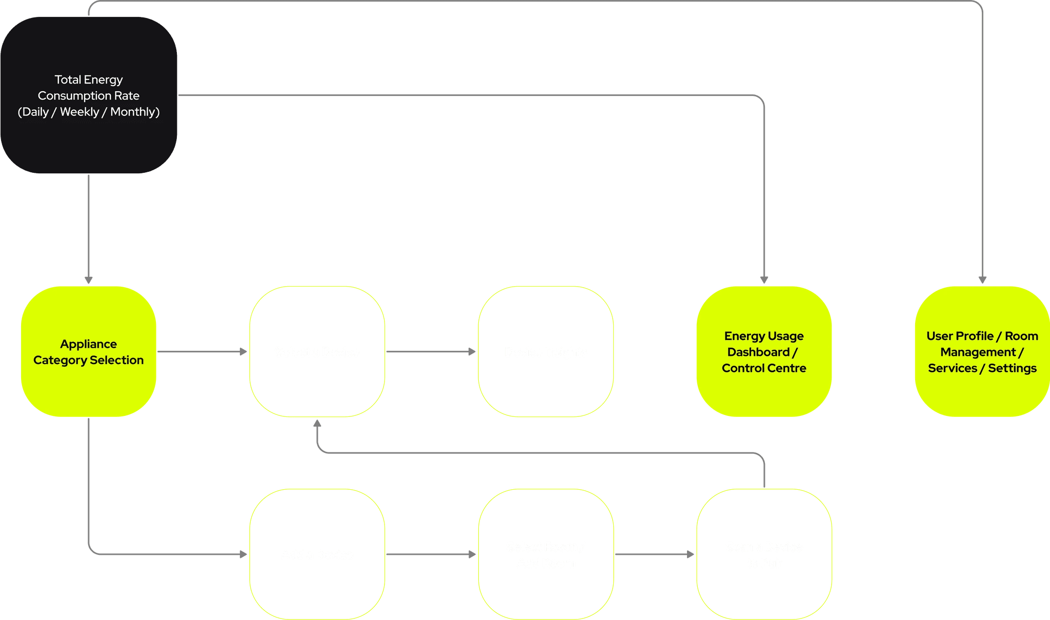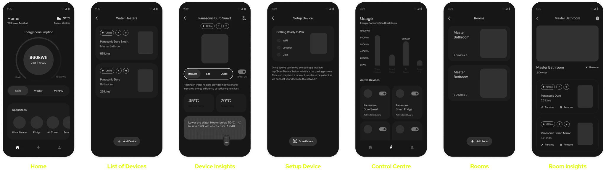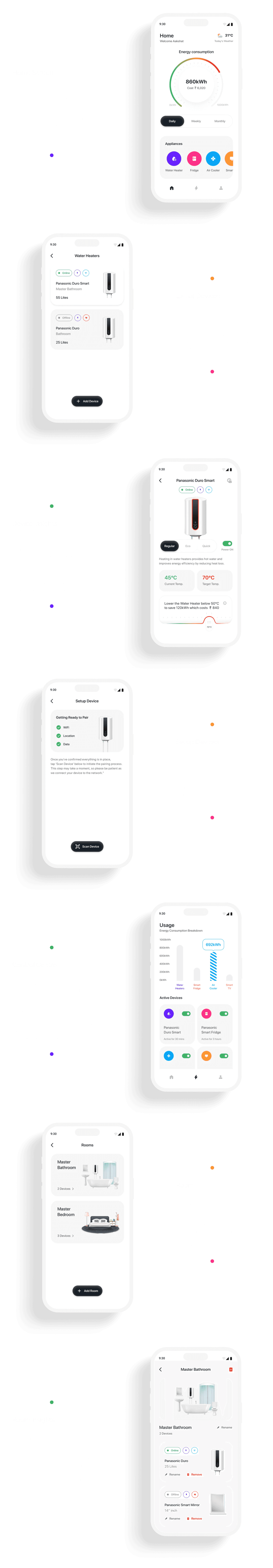 Users start by checking your energy consumption, pick an appliance category, add devices, pair them to rooms, and get insights on how they’re performing. You can also manage everything from a dashboard while tweaking your profile and settings as needed!