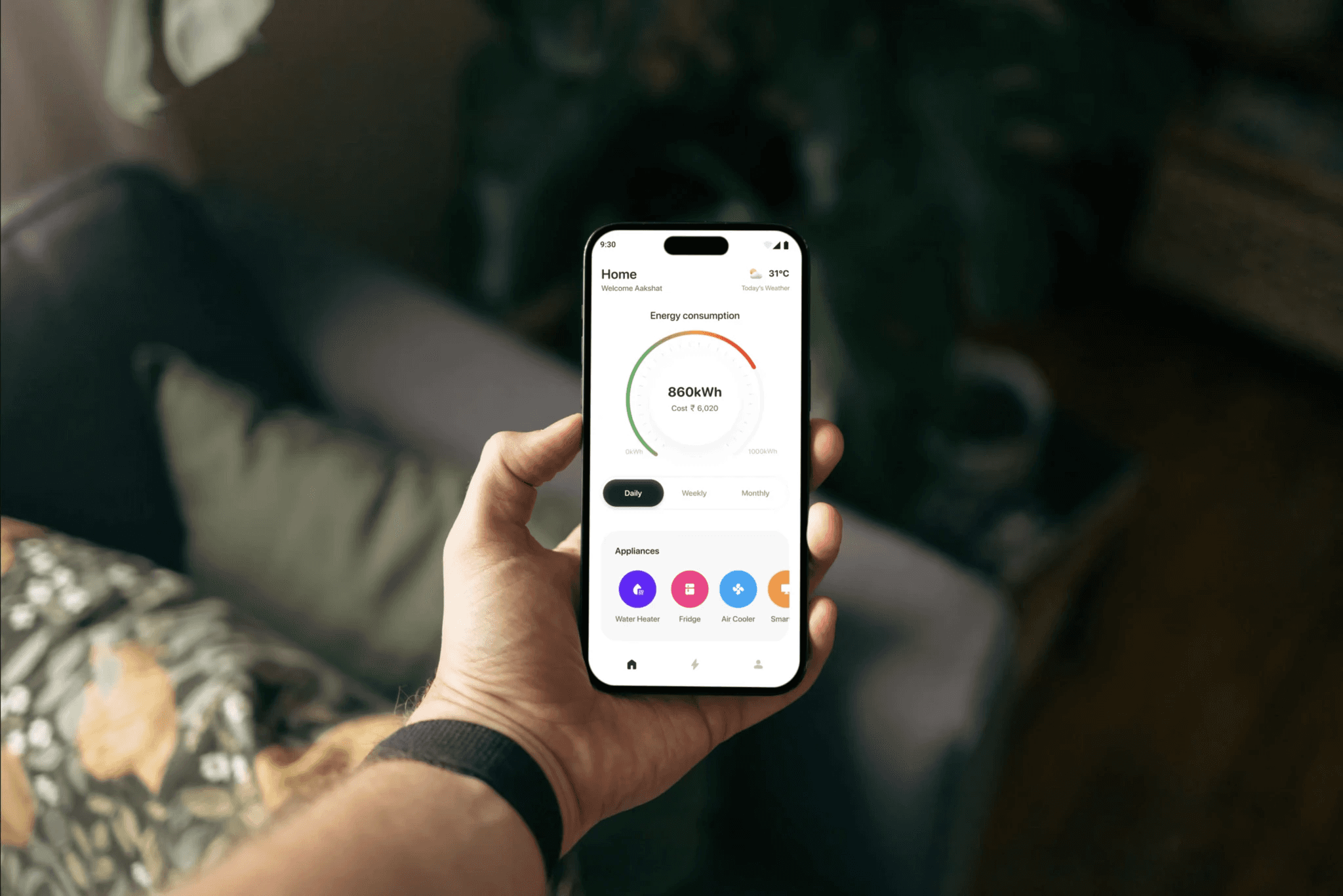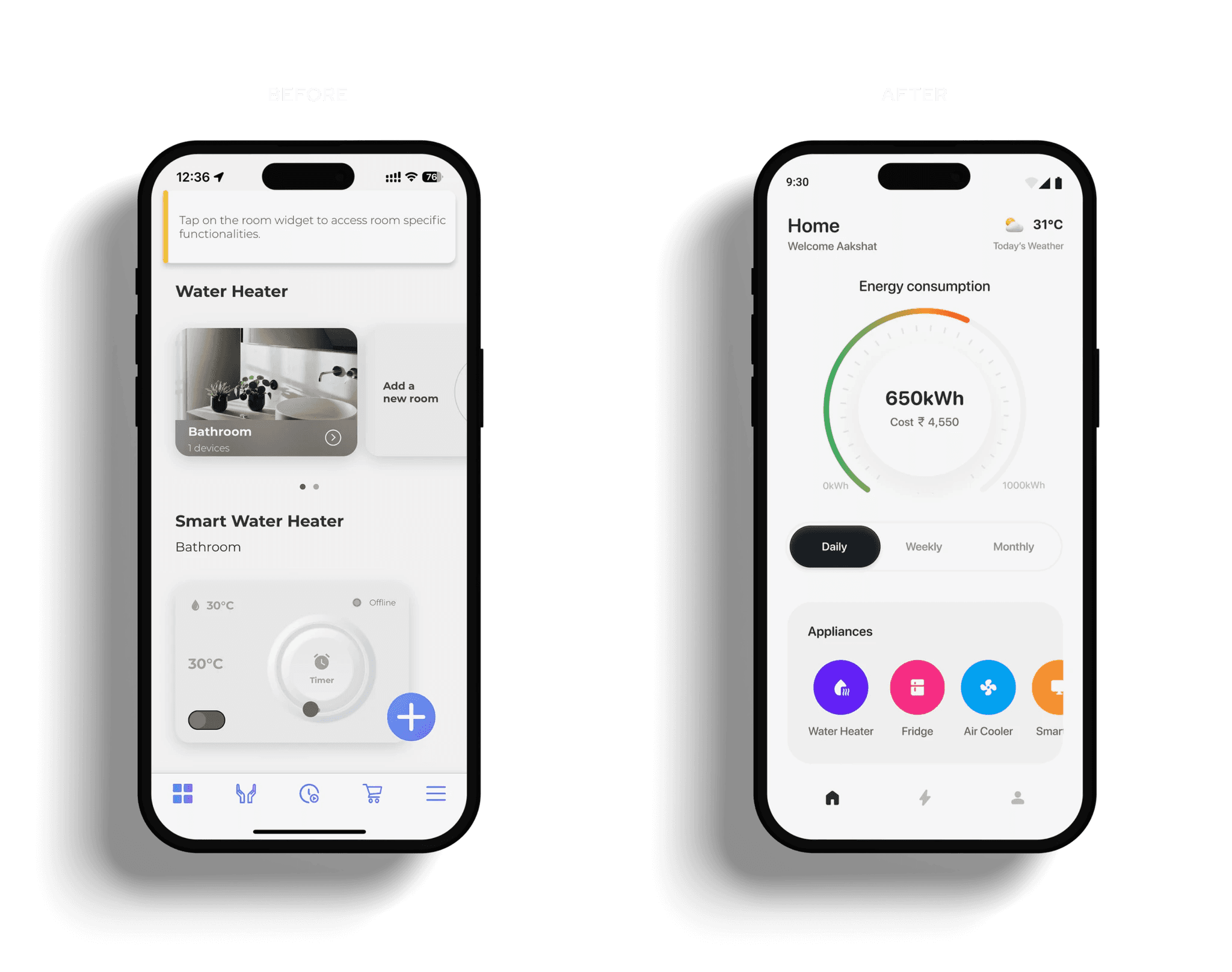 The new design emphasizes energy consumption tracking with a clear gauge, providing users with immediate feedback on their usage (860kWh) and cost (₹6,020). Navigation is streamlined through a bottom bar, and users can now easily toggle between daily, weekly, and monthly views for detailed energy insights.